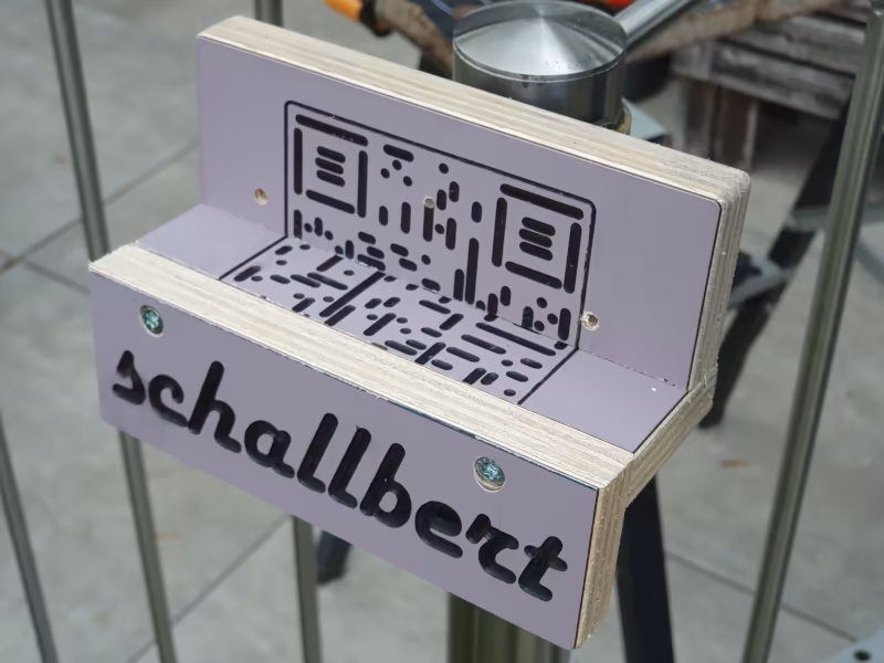 Zwei Beispiele habe ich im untenstehenden Bild vorbereitet: Der CR-Code in der oberen Hälfte entstand mit einem 6mm-Radienfräser bei 0.2mm Eintauchtiefe. Die entstehenden Punkte und Linien fühlen sich durch die sanften Übergänge weich und angenehm an. Der Schriftzug in der unteren Bildhälfte ist mit einem Gravierfräser und bis zu 7mm Tiefenzustellung gefräst. Hierdurch kommt der natürliche Holzton zwar schön zur Geltung, bei kleinen Schrithöhen wie dieser (max. 30mm) entstehen aber leicht Ausbrüche bei Buchstaben mit “Inseln” (a, e, b, o, etc.).